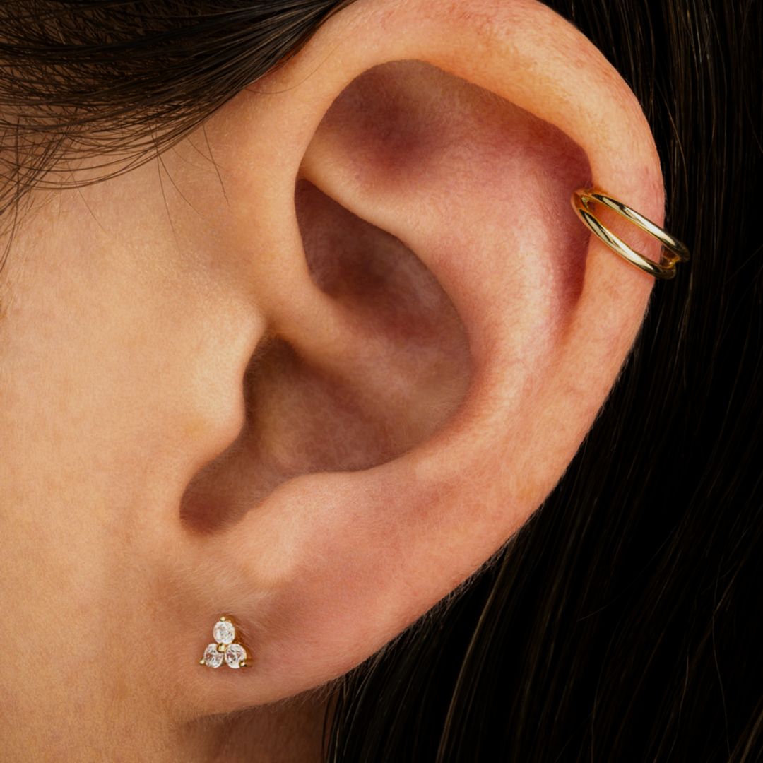 Show off your tragus piercing with a flat back solid gold stud or little huggie hoop. Comfort is definitely in order with this intricate piercing placement