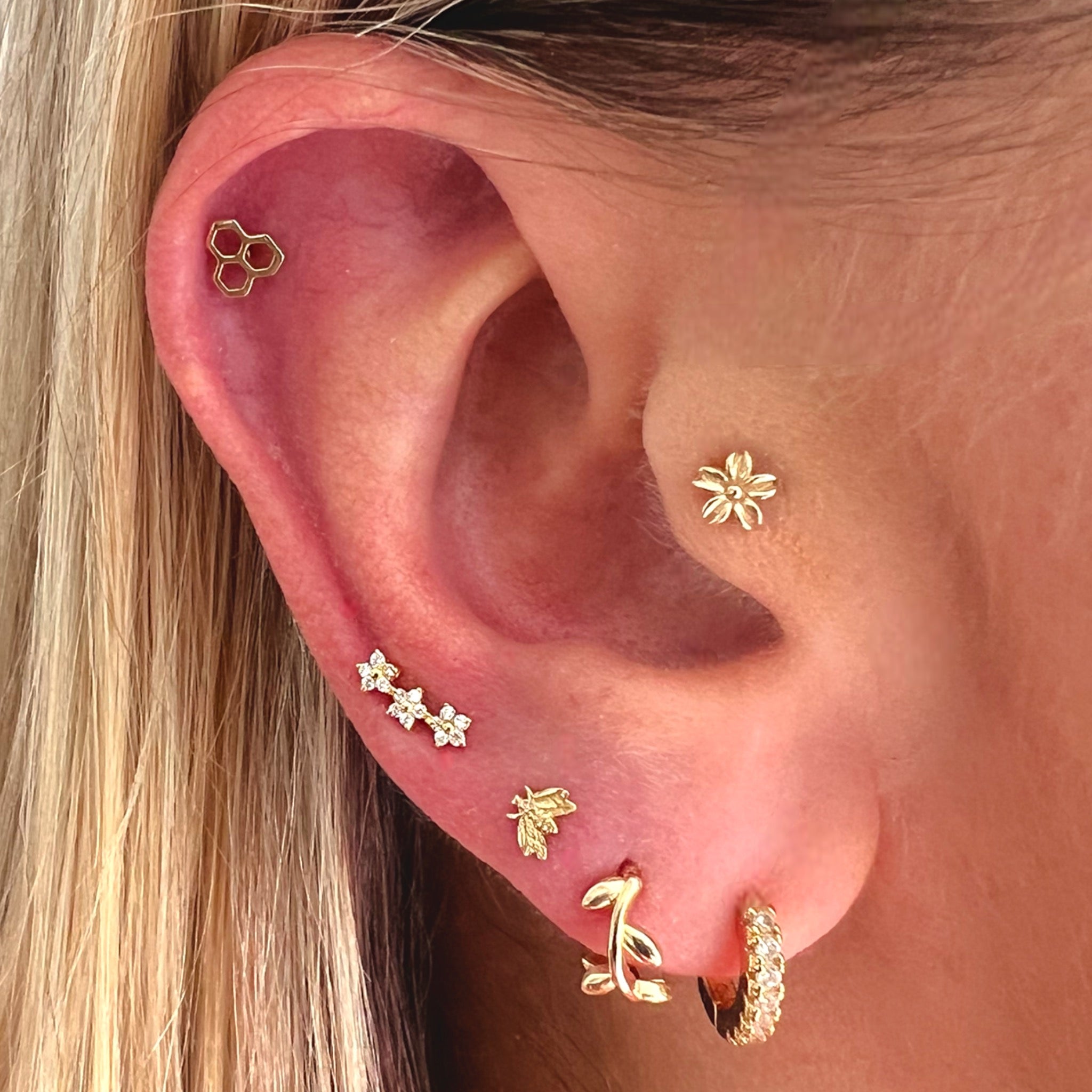 The Vides is a solid 9k yellow gold hoop earring.  A botanical design of vine leaves with a hinged clicker closure simple and perfect for cartilage, helix, and lobe piercings.