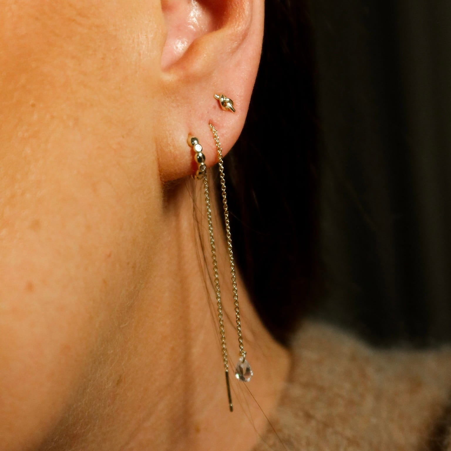 Feed the gold plated long post through your piercing (one or multiple!) and then adjust the length of the gold chain to position it exactly where you want it. Looks great in the lobe or threaded through several piercings