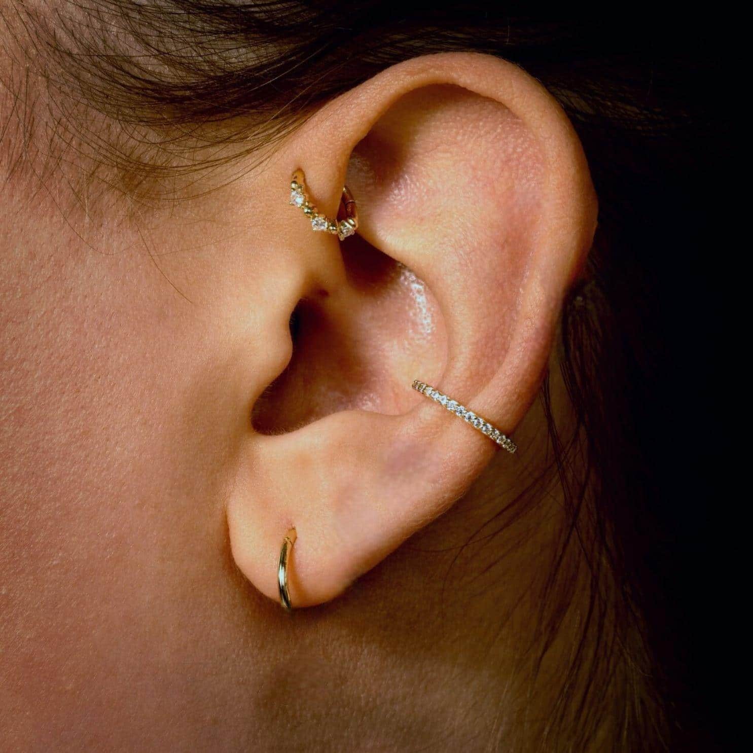 Carefully hand crafted for your conch piercing, the hoop earring is paved with the most stunning cubic zirconia in solid 9k yellow gold. With a hinged clicker closure, and a bigger hoop than standard this beautiful piece is the perfect earring for conch piercing and helix piercing depending on the piercing placement